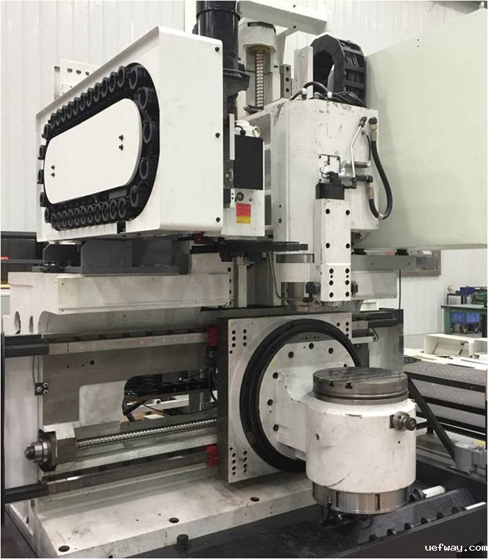 悬臂式结构、直驱技术的双转台;武汉华中848CM数控系统;核心功能部件φ400mm高速铣车复合BC双轴转台自行研发制造;滚珠丝杠:陕西汉江;滚动导轨:广东高新凯特;链式刀库:台湾产品;铣主轴:欧系品牌。机床工作台直径φ400mm;铣削主轴转速20000r/min;车削主轴转速1500r/min。