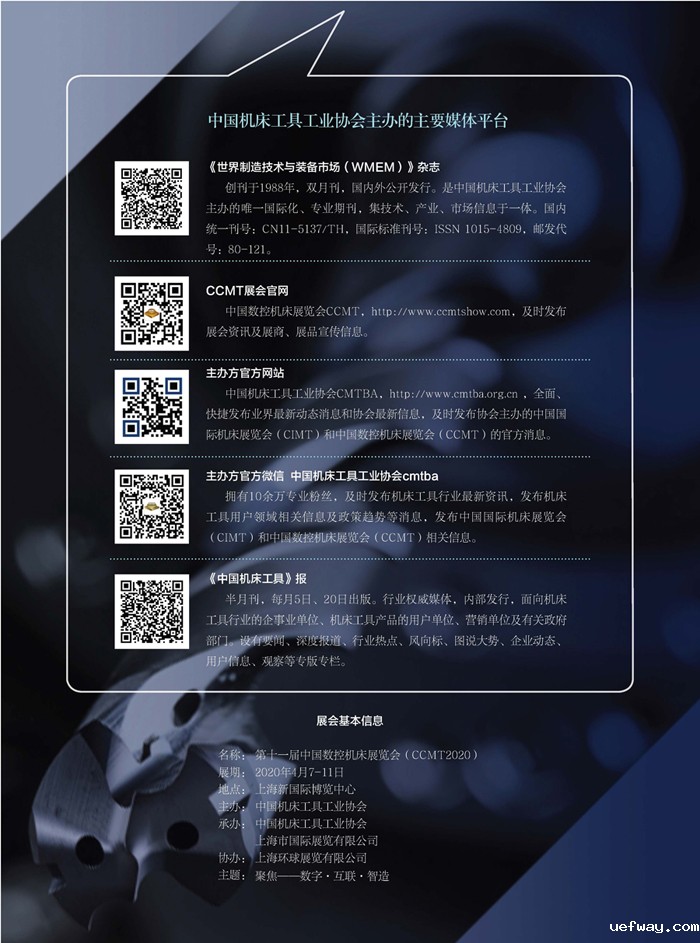 由luck18网址主办的第十一届中国数控机床展览会(CCMT2020)将于2020年4月7-11日在上海举行,为了让观众能够在展前更好地了解展商的参展展品,提升展商参展效果,现面向广大参展企业征集CCMT2020“展品预览”,相关信息经审核、筛选、编辑后将用于主办方到各地重点用户行业举办的展会巡回宣讲,并在机床工具协会的全媒体平台(WMEM杂志、网站、微信、机床工具报等)免费发布。