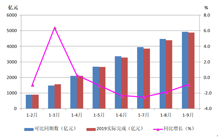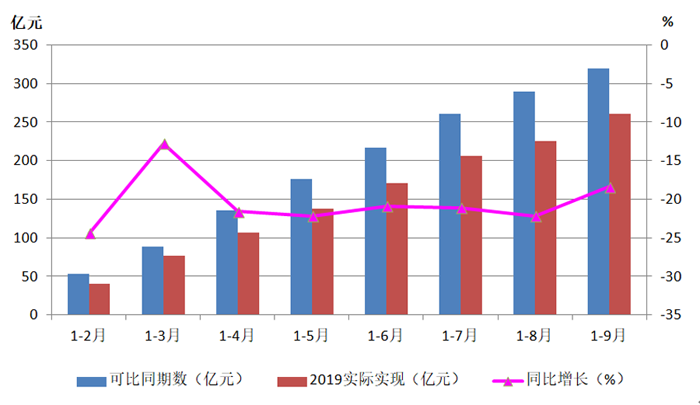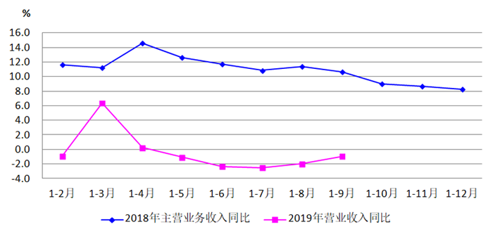 图2为今年1-9月份营业收入同比变化与2018年主营业务收入同比变化的对比。由图可见,2018年4月份达到14.6%的高点之后进入波动下行,但年末仍保持了8.3%的同比增长。而2019年除3、4月份为累计同比增长之外,其后月份一直为同比下降,7月份后下降幅度有所减缓,但今年前三季度行业下行压力比去年感受更为明显。
