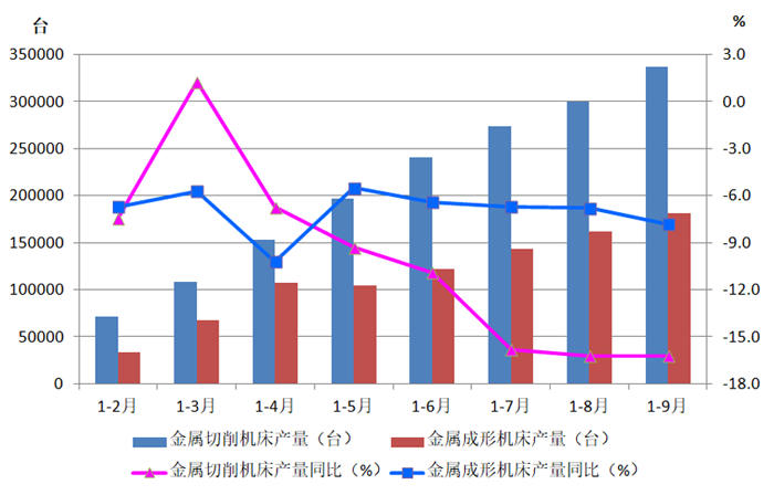 协会重点联系企业1-9月金属切削机床产量同比下降27.5%,其中数控金属切削机床产量同比下降31.8%;金属成形机床产量同比下降17.5%,其中数控金属成形机床产量同比下降2.2%。金属加工机床产量及同比变动情况详见图4。