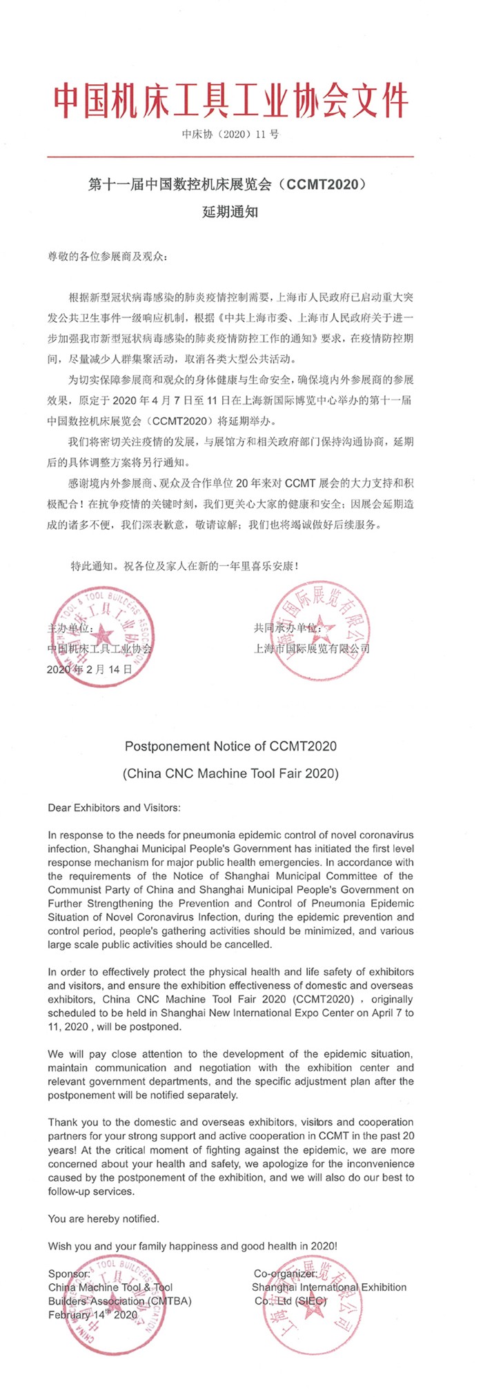 第十一届中国数控机床展览会(CCMT2020)延期通知