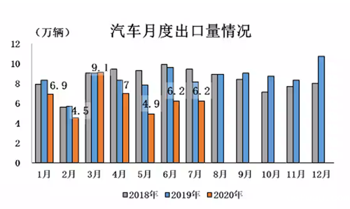 7月,我国汽车企业出口6.2万辆,与上月持平,同比下降23.1%。分车型看,乘用车本月出口4.5万辆,环比增长1.1%,同比下降25.9%;商用车出口1.8万辆,环比下降2.8%,同比下降14 .9%。