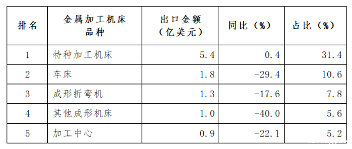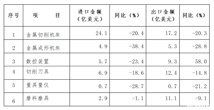 金属加工机床出口额17.2亿美元,同比下降20.3%,降幅较一季度(-23.5%)收窄3.2个百分点。其中,金属切削机床出口额11.9亿美元,同比下降15.8%,降幅较一季度(-20.5%)收窄4.7个百分点;金属成形机床出口额5.3亿美元,同比下降28.8%,降幅较一季度(-29.0%)收窄0.2个百分点。