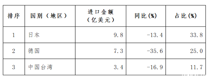 表2 2020年上半年金属加工机床进口来源前三位的国家和地区