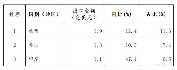 2020年上半年金属加工机床出口去向国中,越南、美国和印度依次占居前三位。因对印度出口同比下降幅度较大(-47.1%),从一季度的第二位退居第三位,美国从第三位升至第二位。这三个国家的金额及占比差距不大,三者占比合计为25.2%。(详见表3)