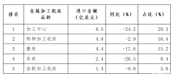 金属加工机床进口额29.0亿美元,同比下降24.1%,降幅较一季度(-32.3%)收窄7.1个百分点。其中,金属切削机床进口额24.1亿美元,同比下降20.4%,降幅较一季度(-27.4%)收窄7个百分点;金属成形机床进口额4.9亿美元,同比下降38.4%,降幅较一季度(-48.5%)收窄10.1个百分点。
