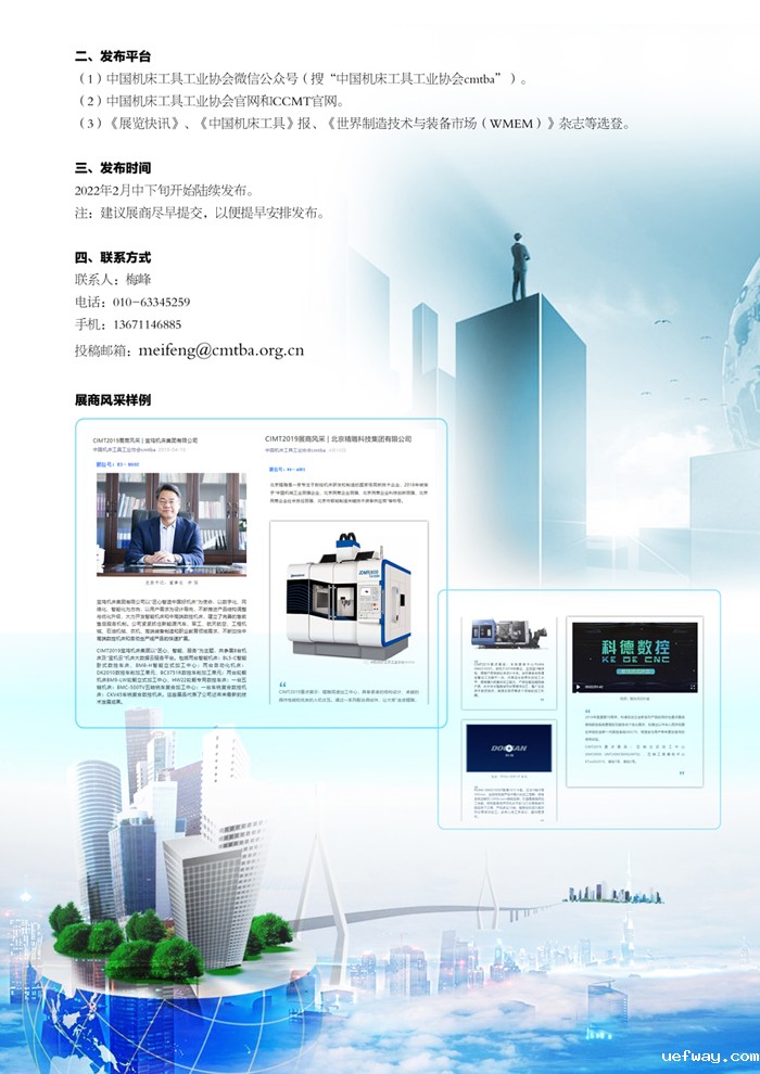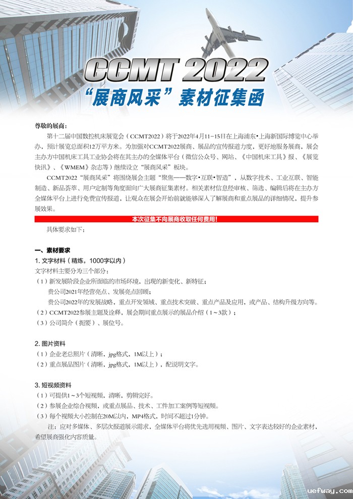 为加强对CCMT2022展商、展品的宣传报道力度,展会主办方luck18网址将在其主办的全媒体平台(微信公众号、网站、《中国机床工具》报、《展览快讯》、《WMEM》杂志等)继续设立“展商风采”板块。