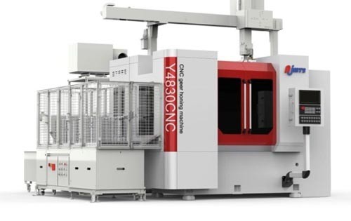 南京二机展出的数控内齿珩轮强力珩齿机Y4830CNC,配置自主知识产权的用户软件,能够自动实现强力珩削工艺以及自动余量补偿。工作台进给轴采用直驱技术,智能化夹持力控制及自动热变形补偿技术,确保高精度齿轮的珩削要求。工件相位检测及自动对齿技术,实现珩齿加工的自动化。