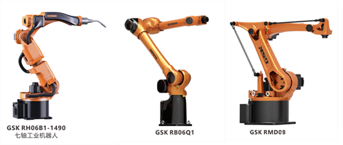 广州数控展出多款工业机器人,其中GSK RB06Q1轻量型工业机器人主要应用于打磨、抛光、机床上下料、冲压自动化等领域。GSK RMD08工业机器人采用四轴设计,具有结构简单、故障率低、占地面积小等优点,主要应用于码垛、拆垛、冲压上下料等领域。GSK RH06B1七轴机器人,应用于激光焊接。