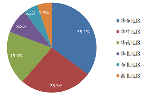 57家重点监测的上市公司中,华东地区20家,占35.1%,居于首位;华中地区15家,占26.3%,位居第二;华南地区11家,占19.3%,处于第三位;华北地区5家,占8.8%;东北地区和西北地区均为3家,各占5.3%。具体分布情况如图1所示。