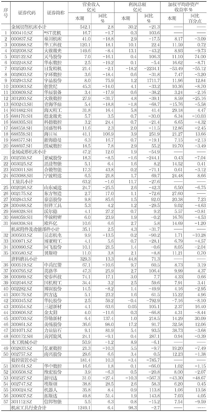 57家重点监测的上市公司中,金属切削机床行业20家,占35.1%,居于首位;磨料磨具行业13家,占22.8%,位居第二;工量具和数控装置行业均为7家,各占12.3%;金属成形机床和机床附件及功能部件行业均为4家,各占7.0%;木工机械行业2家,占3.5%。具体行业分布情况如图2所示。