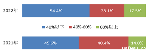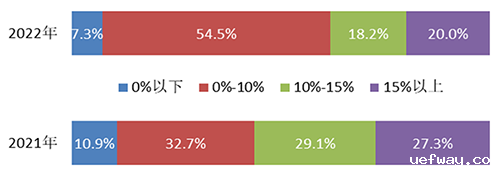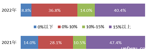 从利润率的分布看,2022年度利润率在0%以下的企业占8.8%,占比下降5.3个百分点;位于0%-10%之间的企业占36.8%,占比上升8.8个百分点;位于10%-15%之间的企业占14.0%,占比上升3.5个百分点;位于15%以上的企业占40.4%,占比下降7.0个百分点。整体分布明显往中间两个区域集中。利润率的整体分布情况见图4。
