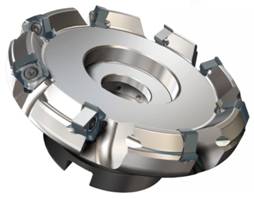 在CIMT2015的三菱公司展台上,我们看到一款被命名为WSX445的面铣刀(图10),采用了双面各四个刃口,又有大的正切削角度,经济性和轻快性兼备。因为切削轻快,所以切削声音比较小。WSX445面铣刀的第二个特点是排屑设计,使得卷曲的切屑不易与刀刃发生磕碰。WSX445面铣刀的另一个特点是刀体上刀片槽底部有凸起的结构,该锥形的凸起能嵌入刀片锁紧孔的锥形沉孔内,万一发生突发破损,也可抑制安装面损伤及刀体的摩擦磨损。