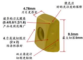 山高刀具在本届展会上推出了T4-08玉米铣刀,采用与立铣刀相同的厚实的刀片(图11),能够为高效切削提供保证。这种玉米铣刀在刀齿的安排上是全齿的,一个容屑槽上的刀片轴向搭接构成一个完整的加工齿线。T4-08玉米铣刀的端齿和离端面较远的齿有不同的刀片槽角度,这是因为端齿要承担平面加工的任务,需要在端面上有刀具后角,而离端面较远的刀片无此任务。