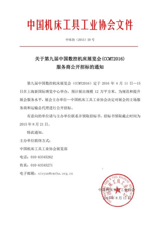 第九届中国数控机床展览会(CCMT2016)服务商招标通知