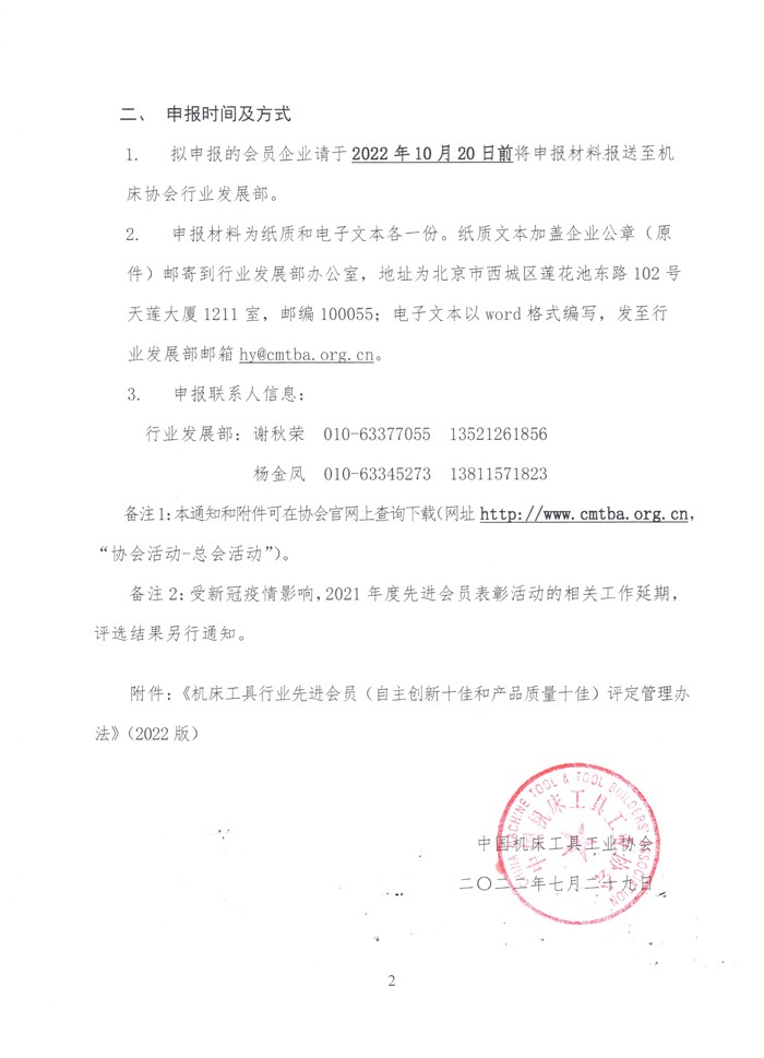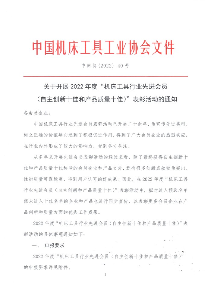 2022年度“机床工具行业先进会员(自主创新十佳和产品质量十佳)”表彰活动的具体事项详见以下文件。请申报企业注意时间节点:2022年10月20日前 将申报材料报送至机床工具协会行业发展部。
