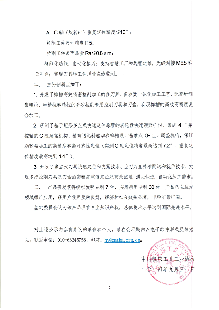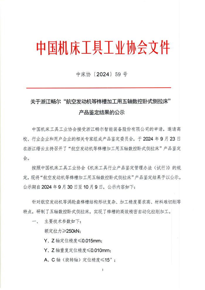 关于浙江畅尔“航空发动机等榫槽加工用五轴数控卧式侧拉床” 产品鉴定结果的公示