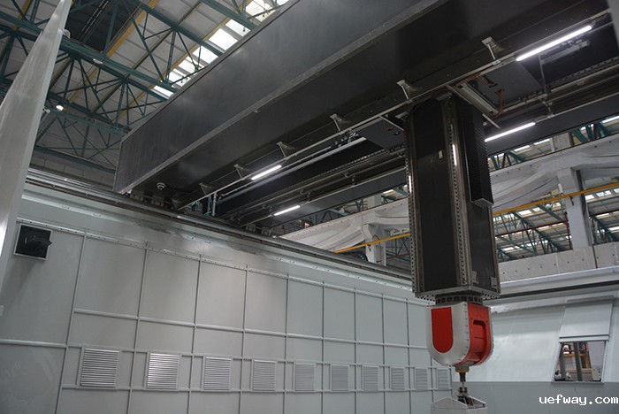 7.国内首台大行程超高空间定位精度整型部件加工机床:创新采用碳纤维复合材料制造金属切削机床龙门横梁移动部件,研制了用于四代机整型部件批产加工的高空间定位精度高端装备,在9m×5m×1.7m范围内空间精度达到2µ/m³,达到国际领先水平,满足了飞机装配过程中对外形公差、对缝间隙和阶差等装配特征的高精度要求。