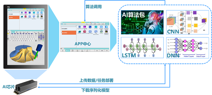 华中9型智能数控系统践行“智能+”为机床赋能的创新理念,构筑人(H)-机(P)-信息(C)融合的数字孪生系统(S)(HCPS)。该系统深度融合大数据与人工智能技术,打造了“端-边-云”的智能体系架构,形成了集成AI芯片的智能硬件平台、支持AI算法的智能软件平台、构建智能APP生态的开放平台。