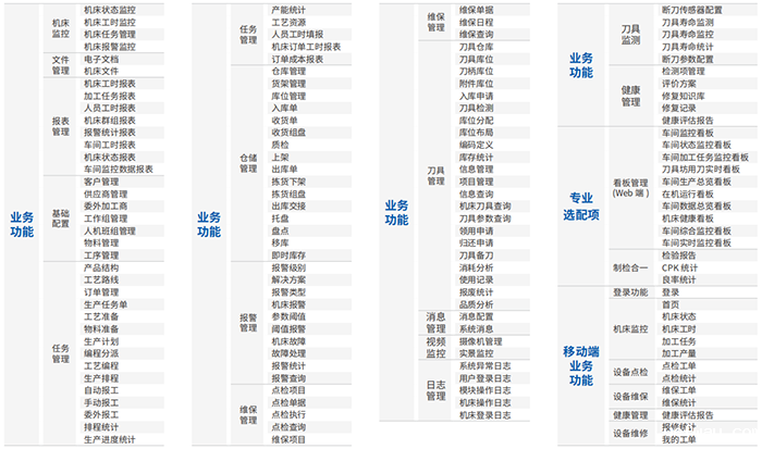 功能模块:资源文件管理、刀具标准化管理、自动化产线监控、设备维保管理等。