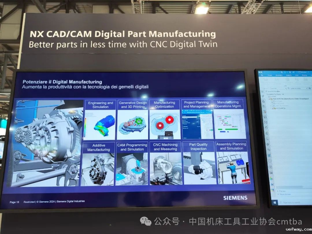 德国SIEMENS公司展示了SIEMENS NX集成式制造系统软件,可以对机械、电气等部件进行辅助设计,进行工艺编程、仿真、生产规划、车间数据联通和流程管理,应用于数控加工、机器人、3D 打印和质量检测工序。