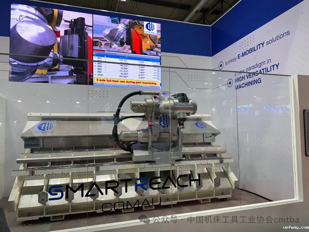 意大利COMAU公司在本届展会推出全球首发Smart-Reach高速加工中心,机床采用一个直线轴和多个关节机械手的旋转轴,以半圆柱形包络面围绕工件移动,具有五轴联动加工功能,工件一次装夹可实现六面加工。机床重复定位精度±0.003mm,X/Y/Z轴的快移速度为80/90/90m/min,加速度0.8g。适用于大型轻量化结构件的高效灵活加工,如大型铸件底座、电池托盘、航空结构件等。