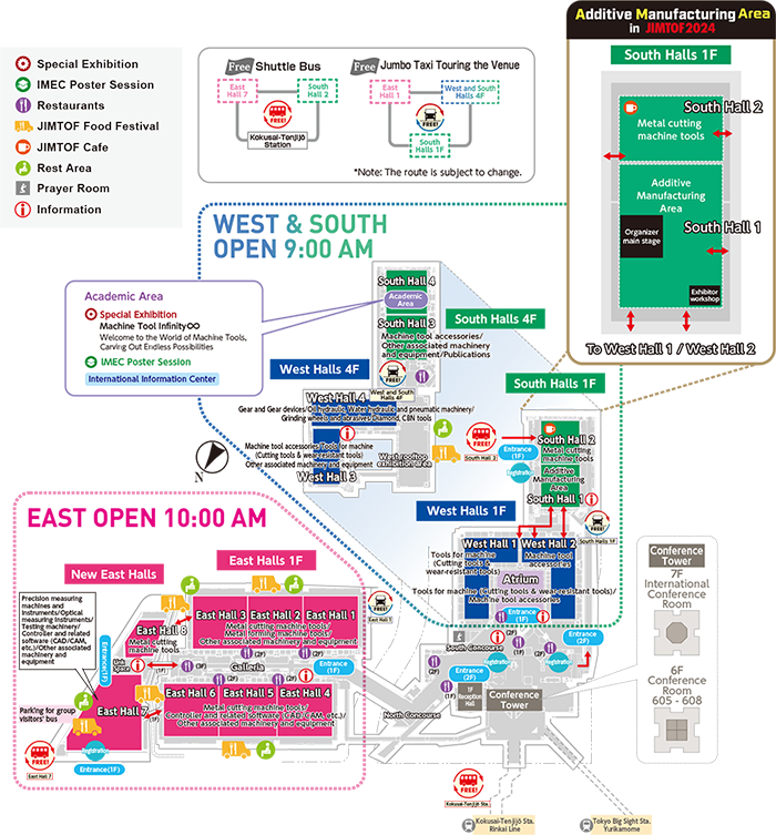 JIMTOF2024展会的展览面积是118540m2(本届展会使用东、西、南馆),成为JIMTOF有史以来最大规模的一届展会。其中,南馆为新启用的展馆,主要展示部件、系统、增材制造展区、学校成果展、学生招聘区和国际协会区等,也作为开幕式的举办场地;东馆主要是展示机床主机及相关部件;西馆主要是展示切削刀具、磨料磨具、部件及软件等。